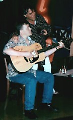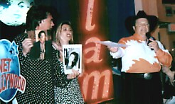 This lucky fellow offered to pay $100 to play guitar and sing with Marty. The guitar he's using was autographed by Marty, Tom Arnold, Linda Davis and the Dixie Chicks and was auctioned off later for $475. The song we all sang was "Happy Birthday" to Planet Hollywood. It was their second. Later, when Marty videotaped a promo, he added "14 more years and you'll be able to drive." Tom Arnold autographed a movie poster and picture which sold for $30. Linda Davis brought a beautiful dress which went for $505. Curb recording artist and comedienne Kacey Jones performed her song "Put the Seat Back Down" and donated an autographed CD, picture and Johnny Light.