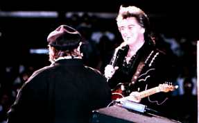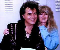 Mario snapped a photo me of and Marty -- actually two of them but Marty wasn't looking at the camera for the first one. I figured I might get a new picture for my Welcome Page, but I look a mess (I really do need to put some blonde in my hair) and I'm draped all over Marty, so it looks like it needs to go on this page for the time being!!! (Maybe at the Fan Club Party.) By the way, I had someone come up to me and ask if I was Connie. I'm still trying to figure out if she meant Connie as in Marty's wife or some other Connie. As you can see, I certainly can't be mistaken for Connie Smith -- Mrs. Marty Stuart. If, on a scale from 1 to 10, Connie's a 10, I'm about a -2. But I got a chuckle out of it. By the way, Marty's holding the paper from CountryCool.com