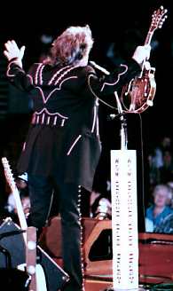 Johnny Russell brought Marty and the band on stage and they shared a joke (about a dog that Johnny sold to Marty -- a Doberman). Steve had mentioned they were performing "Sometimes The Pleasure's Worth The Pain" which I call an updated version of "Tempted." Marty said he wanted to rock the house. It certainly is a rockin' song. Then they performed "Dark As A Dungeon" the same hauntingly way they performed it in Metropolis. Marty stops playing the mandolin halfway through the song and the emotion of the song pours out through his arms. The picture below really shows this.