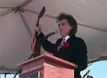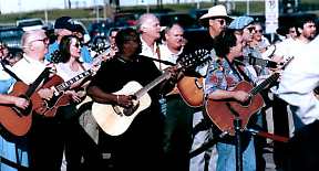 Marty brought with him the guitar Jimmie Rodgers used to record the Bristol sessions. Marty held the guitar as he spoke: "And I'm standing here holding the most precious possession in country music. This is the guitar that Jimmie Rodgers played at the Bristol sessions along with the other people up there that helped start country music. It's a precious day and this is what it's all about for me. We have fans from all over the world. We have our Hall of Fame members. We have executives. The genius of this city has invented something that's about to happen. Right behind us we have the mother church of country music (Ryman Auditorium). Today we're about to break ground on the sanctuary of country music. I think what Moses was told by God. He said 'Son take your shoes off. You're on Holy ground. This is Holy ground. This is Holy ground.' So many people have sacrificed their love and their life and their families for this moment. It's our treasure chest. As an artist, it's where we want to all wind up. Every note I play is aimed at this building, for the long haul. And I want to thank every one of you on the front row. I love you and I thank this City for letting a part of this. God Bless You Patsy Stone. Thank you very much." Marty was holding back the tears as he finished his emotional speech. Everyone joined in for "Will The Circle Be Unbroken." Other country artists on stage included Clint Black, Mark Collie, Paul Brandt and Connie Smith. The new Hall of Fame is scheduled to open in May 2001.