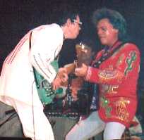 Then it was Jerry Lee's turn and it went like this: What more could I say; he is still that good. Marty encouraged an encore and had played along on a few of the songs, but Jerry bowed and was gone. They announced the meet and greet on the 2nd floor balcony. 3:00 a.m. my time and the caffeine was wearing thin. I'm sure it would have been 5:00 a.m. my time before I got back to the hotel if I'd stayed, and I had meetings the next day. Hope it was fun! Saw many familiar faces, but missed being able to see everyone during a fan club party. Review and pictures by Mary Runyan, Dayton, TN |