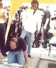 | Marty waits as they prepare the concrete. | Marty places his boots in the concrete. |