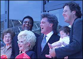 | Marty shares a laugh with Hall of Famers Kitty Wells, Charley Pride, Brenda Lee and fellow Opry member Vince Gill (holding daughter Corrina) |