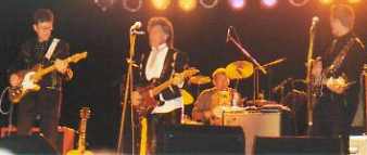 When he got there he said, "Did all these people behind you get here after you did, or was this spot just open?" He couldn't believe I got that close. I hadn't thought about it, but the spot I found and the spot Brenda got were the only empty places that close when I got there. Except right against the fence. Which wasn't very good for pictures through the mesh. Chairs were set up everywhere, owners gone. I had my Marty beach towel and spread it between our two chairs for the others. We set up about 3:30. Needless to say, I got a good suntan. We were only a row back from the front which had an orange mesh fence up between us and the stage with maybe 12 feet between the fence and the stage. I kept watching for LaDonna and Brenda and soon here they came. LaDonna and Carol sat between me and Lynn, then Brenda and her husband were only four chairs away. Brenda really looked good, like she is feeling a lot better.