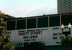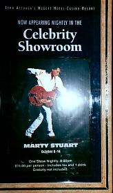 Marty looked GREAT! He wore black leather pants, black shirt with red rose buds up the lapel and the black jacket with red horseshoes. He hollered "HOWDY!" and just went nuts, singing, picking, and dancing. He did, "Doin' My Time," "Red Red Wine and Cheatin' Songs," "Tempted," "Burn Me Down" and "Country Girls." Someone handed him a note wanting him to wish this lady a Happy Birthday. He asked where she was and how old she was. She told him she was 80 and she wanted to know if he would sing "Red River Valley." He said "Will ya give me $10 if I know it?" and promptly sang and played the whole thing! He said he had gone for a walk that afternoon and ran into a street person,"and ya all know I LOVE hobo's and bums." The guy said "Hey for 5 bucks I'll tell ya the funniest joke ya ever heard." Marty said "Well I can't pass that up." He gave him 5 bucks and the guy said "Do you know what President Clinton regrets most about his affair with Monica?" Marty said "no" the guy said "Give me 2 more bucks and I'll tell ya!" Marty had to know so he gave him the 2 bucks and the guy said "That he didn't have Ted Kennedy drive her home!" The crowd liked that. He did a couple more songs, "Only Daddy That Will Walk the Line," "Southern Accent," "Reasons," "Now That's Country" and "This Ones Gonna Hurt You." His voice cracked a little and he said he was having a little trouble so he asked for some hot tea and said he'd just pick a little. He did "Marty Stuart Visits The Moon," and "Can't Help Falling In Love," and everybody sang along, He did "Oh, What a Silent Night" and "Hillbilly Rock" and said "goodnight, see ya tomorrow night." He walked along the stage shaking hands and he flipped his pick to Heather. The crowd just screamed and clapped so he came back out for an encore. He did "The Whiskey Ain't Workin" and "Hey Baby." That was it, He was FABULOUS!!!! Then they announced a Meet & Greet. He Did It!!! There were only about 12 people so we stayed toward the end. I was so excited! I walked up to him and he said "Howdy! How far did you come?" and I said "2,500 miles" and he and Mike both said "Is that all?" and I said "Yep that's all" and Marty gave me a Big Hug and said "I LOVE YOU." I about DIED! Then he asked me where I was from and how long I was staying I told him I would be there Sunday and Monday and he said he would look for me!