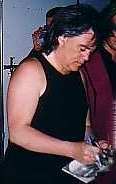 The Meet &Greet went as they normally do, with Marty and the band at the merchandise table signing autographs. It was a shorter line than usualout of the 600 or so in lawn chairs, only about 100 actually queued up, so we were pretty much near the front. The three of us went in a group through the line. Marty was first and he was in a sleeveless tank shirt, presumably from the heat. We got stuff signed and Jamie got a picture with Brian Glenn, which she always likes to do. I personally appreciate the fact they are all gracious enough to pose for pictures; many artists arent.