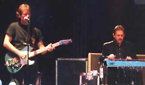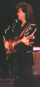 Slyly, I moved my husband in that direction. There were several booths along the way, so I was able to draw his interest to them, thus inching our way slowly westwardly. Soon, I was faced with a wide bit of territory, completely bare, separating the last attraction from my intended destination. As I stood there, the stage, like a metal giant, continued to beckon. Out of ideas as to how to get him there without him realizing my true motives, I gave up and just walked in that direction. He followed. We arrived to find a handful of people already there, we chose our spot and sat down. It was still 4 to 5 hours before 'Martytime.' Bev and Serena arrived later, then I knew for sure, it was "MARTY PARTY IN PROGRESS!" Unfortunately, we had to sit through a rock band called 'Big Loo' (which I dubbed 'Big Boo' rather quickly) I guess they were all right if you like that style of music, but to me it was just a continuous, loud and irritating, noise. As the sun sat, a huge full moon appeared, hanging over Texas like a soft spotlight, ready to welcome a man who truly deserves the moon and all the stars. Then suddenly, Wichita Falls was rockin' hillbilly style! Marty stepped out on stage among the thunderous applause of a very appreciative audience. Dressed in black, and looking magnificent (as always) he began singing 'BROWN EYED HANDSOME MAN.' Next we were treated to Buddy Holly's 'WELL ALL RIGHT,' then entertained with 'THE WHISKEY AIN'T WORKIN'. Afterwards, we were taken for a ride on the 'BLUE TRAIN' then we were 'TEMPTED.' During the songs, Marty would often look our way and smile. I leaned over to my husband and said, "Doesn't Marty have the sweetest grin." This remark only caused him to give me a strange look, so I decided, this must be a gal thing. During the show, Marty spoke of the recent CMA awards, and asked our thoughts on what Alan Jackson did. He said he had sent Alan a telegram of support, and then he gave us a short version of his personal feelings on the subject. "I have nothing against the country music of today," he said, "in fact, I like a lot of the songs, but let's face it, now you're Texans, you know... it just ain't hillbilly!" The 'Meet And Greet' took place after the show, so around back we all headed, lining up for our personal few seconds of heaven. We had a bit of a wait as Marty wanted to shower and change before meeting with us. While we were waiting, Jodee stopped by to visit. Then, two things occurred almost at once. The police informed us that anyone with a car parked within a particular fenced area would have to hurry and remove them or the gates would be locked, and we'd not be able to get to our vehicles until Tuesday. Almost everyone in the line had their car parked within that area, so the policeman took one load of people up to move theirs and was coming back for the rest of us, but before he could return, the gates opened. Marty won, we all went in, leaving our cars to fate. As we left, I turned for one more final look. All the bright lights were off, the stage was devoid of equipment, and the park was empty and silent. A policeman drove up and offered to give us a ride back to our car. I was happy to ride. My feet were beginning to tell me I'd been on them too long. Back at the car, as we loaded our things, I thought how much God had blessed me that day. I saw Marty Stuart and The Rock And Roll Cowboys perform, I met with Marty afterwards, I met Bev and Serena, and later Jodee, and experienced all this with my husband at my side. Who could want anything more? Review and photos by Darlene Renteria, Ringling, OK |