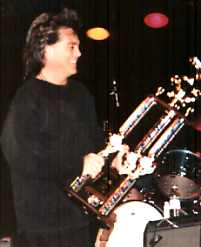 Well it was more information then we had. We went in and were given a flyer with the list of performers: Beginning at 5:00 - Blue and Lonesome, Mountain Heart, J.D.Crowe, and Marty at 10:00 p.m. It is now 1:30 Indy time so can you say "long wait"?! We took our chairs up to the front row, of course, and sat next to Glenda and Clarence. It is always great to see them. After sitting so long you tend to get stiff so we watched their stuff and they watched our stuff when we needed to stretch our legs. We watched as the guys set up and as Les did all his "sounds" that always amazes me. Spike looked over, said "hi," and then he said, "I thought you guys lived on the west coast?" We said, "No just travel to Sparks to see the shows." We asked if any were going to be scheduled out there again and he said not that he knows of. Randy came out and tuned up and said, "You ain't here early are ya?" Well you know you have to do what you have to do! Time was passing and the crowd was not increasing in size. If there were 200 there when Marty came out I would be surprised. We walked around a little and talked quite a while to Jimmy. He said there is a new white T-shirt on the way so we can look forward to that. I told him, "Good" 'cause I had everything else! About this time we ran into Cindy from Alabama, and Smally. Good to see them as well. The show started at last. The first group was Blue and Lonesome. They were very good. The lead singer was really good. I think my favorite was Mountain Heart (other then Marty of course!) They had a fellow that played banjo who had no fingers, just his thumb on his left hand. Watching him play was truly a treat. They had a 20 year old fiddle player that just burnt it up as well. J.D. Crowe and the New South were next and they did some old bluegrass and gospel. The day was most enjoyable.