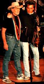 After a brief intermission, Marty finally was introduced. While he played mandolin, Rock and Roll Cowboy Brad Davis joined him in acoustic guitar, Brad's brother Greg played banjo and "Superman" played the upright bass. They performed a bluegrass instrumental I should know, but don't. They also played "Marty Stuart Visits The Moon. and dedicated it to Grady" Willie Nelson walked out on the stage. One of the honorees of the evening, Grady Martin, played guitar and toured with Willie Nelson from 1980 to 1994. Marty said, "The first tour that we were ever on Willie let us go open for him and I used to go out every night just in time to watch Grady played the solo." Willie picked up his faithful guitar, Trigger, and Marty said, "Willie, that guitar suits you just fine." With an all-star band that included Vince Gill and Marty, Willie played some of the hits that Grady Martin played on--which included "El Paso," "Don't Worry," and "Pretty Woman," Since Grady Martin is in ill health, his son, Josh, came up to accept his father's Chettie award.