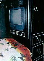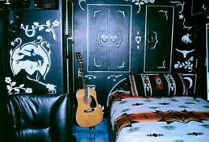 He loves the road, but not all the time. "The road ain't nothing but a lonesome piece of ground," he says. "I hate sundown when I'm away from home. I keep pictures around that remind me of the people I love." He thinks of his bedroom as a big black hole. Black cabinets with cowboy designs, black leather sofa, black leather walls. "Perfect for bouncing off of," Marty cracks. The pillow was made from a '40s Chimayo blanket; the bedspread came from a discount store.
