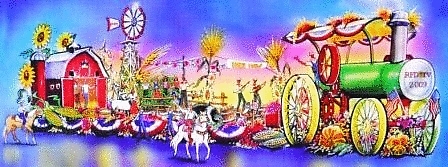 RFD-TV founder and President Patrick Gottsch of Omaha described the float as a tribute to America's farmers and ranchers. The entry in the New Year's Day parade in Pasadena, Calif., takes its inspiration from one of the shows on its network, Hee Haw, which marks its 40th anniversary in 2009. Country music veterans Connie Smith and Marty Stuart will sing on the float and also will take off their hats and salute the audience from a cornfield in Hee Haw tradition. Gottsch and Gov. Dave Heineman unveiled a sketch of the float at a press conference Thursday at the Omaha Press Club. The governor said the float is worth millions of dollars in marketing and promotion for the state. "This is exciting," Heineman said. "They are a successful Nebraska company, growing nationwide. They epitomize what Nebraska is all about." Gottsch said the $300,000 float will showcase food and fiber produced on American farms in the 50 states. Some, such as corn and soybeans, will be the actual products. Others, such as a pig, will be fashioned from plant materials. Roses named for country music stars such as Dolly Parton, Reba McEntire and Minnie Pearl will be used in the finishing of the float. Gottsch said RFD-TV plans to make a Rose Parade float an annual tradition and has already started to plan a 2010 float showcasing the FFA, rural youths and modern farm technology. RFD-TV one of six TV networks that will broadcast the Rose Parade will include the equestrian units that some of the networks cut out, Gottsch said. RFD-TV is carried by satellite providers such as DirecTV and DishNetwork and recently has been added to the Charter Cable lineup. Charter reaches most of Nebraska, outside the Omaha and Lincoln areas. ============================================================================ The barn walls are Christmas red chrysanthemums. The sunflower petals consist of finely cut yellow strawflower, with centers of finely cut walnut shells. The windmill is made with white rice and finely cut red strawflower accents and accented with a grapevine. The pumpkins are created with orange lentils, pale yellow split peas and brown lentils. The ears of corn are created with finely cut yellow strawflower kernels and ti leaves. By Jane Palmer |