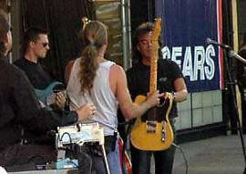 Another thing I've become very aware of are the different levels of recognition Stuart encounters. When we piled out of the buses at a diner in a strip mall outside Pleasanton, the customers studied us closely as we filed in, but said nothing. Five minutes later a waitress approached us. "Everyone wants me to ask who you guys are," she said. "We're here to play for the fair," said one of the crew. "Oh, is one of you Marty Stuart?" asked the waitress. "Yep," said Marty, pointing at me. "Oh, welcome!" said the waitress. Then another one of the crew spoke up. "Naw, we're Air Supply." Back at the Quality Inn in Petaluma, there is now an autographed picture of Marty behind the desk. It joins a group of four or five other country stars and one musical troupe. Of course, truth be told, Marty did not sleep in the hotel. He stayed on his bus. He did, however, use the pool and the pay phone. I know, because I was there. In room #255, should the management wish to post some sort of commemorative plaque.