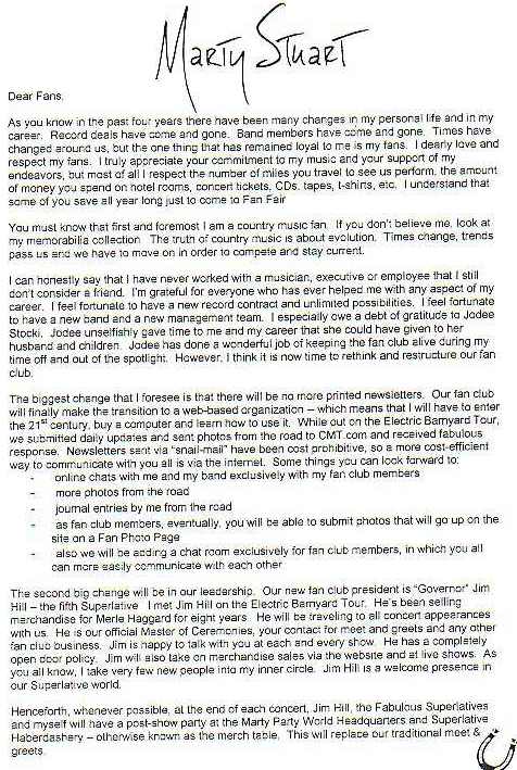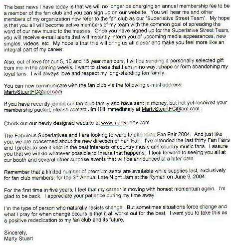 This letter went out to fan club members October 3, 2003.