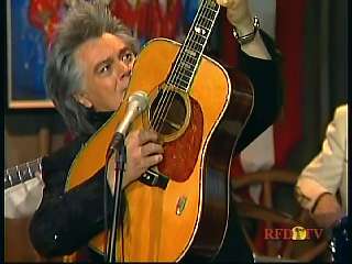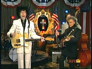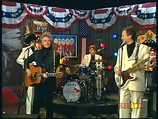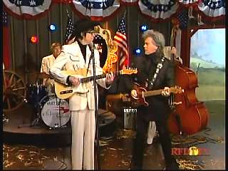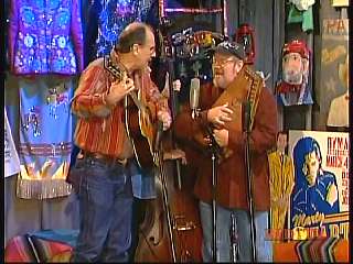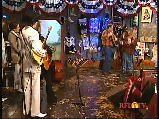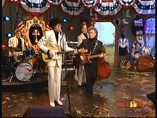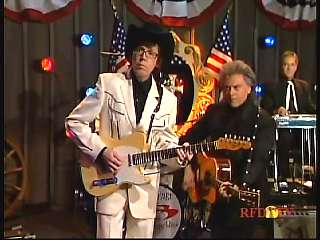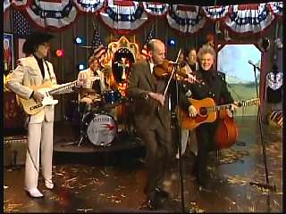 Marty said, "Thank you for tunin' in The Marty Stuart Show. Had them California blues, Superlatives. Sounded good, Mr. Carter. Now let me tell ya about a sound. It is the blues and country music and gospel music all rolled into one. Comes from the eastern state of Tennessee right in the corner of Virginia. Almost a hundred years ago, Mother Maybelle, Uncle A.P. and Aunt Sara Carter came across the mountain with a sound that has become synonymous with American music. Truly spiritual, wonderful music. Carryin' on that great sound is Janette's little boy, Uncle A.P. and Sara's grandyoung'un, along with his great band, Hello Stranger. From Scott County, Virginia, ladies and gentlemen, how about a hand for Mr. Dale Jett and Hello Stranger with a great Carter Family song. .Welcome children. There's Oscar and Teresa and ole Dale." They performed "No Depression In Heaven."