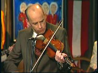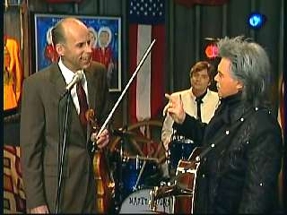Marty said, "Yes, sir. That's beautiful. Fine job, Dale Jett, Oscar, Miss Teresa. Thank you so much." Eddie Stubbs said, "Great job right there from Dale Jett and Hello Stranger. 'No Depression In Heaven'. Boy, the sounds of early country music is alive and well here today on The Marty Stuart Show." Eddie promoted the two DVD set of highlights from the first season of The Marty Stuart Show. After a commercial break, Marty said, "Welcome back to The Marty Stuart Show. Hey, Superlatives. Dale and Oscar and Teresa loadin' up them hay bales. Fine job. Eddie Stubbs. You got a second?" Eddie comes over to Marty carrying his fiddle. Marty says, "Hello, Mr. Stubbs." Eddie says, "Hello, Mr. Stuart. You rang?" Marty says, "Yes, sir. Fillin' in for Connie Smith today, I tell ya what. We closed Season 1 with you playin' the fiddle and the cards and letters poured in. Folks wanna hear you play some more fiddle. You're not as pretty as Connie Smith." Eddie said, "Well, that's for sure." Marty said, "Yeah, but you play the fiddle better than she does." Eddie said, "She's got a lot more hair than I do, too." Marty said, "How 'bout fiddlin' us a little tune." Eddie said, " 'Wake Up Susan'. Will that be all right?" Marty said, "That's a good one. In the key of A." Eddie said, "In the key of A."