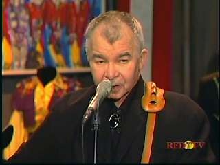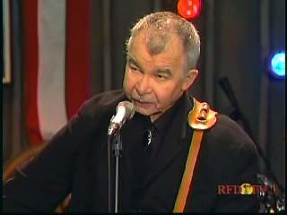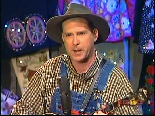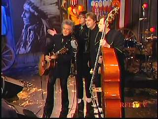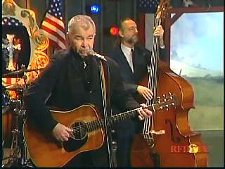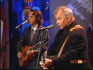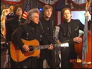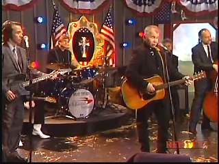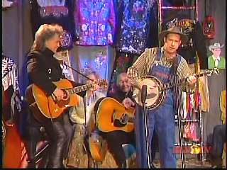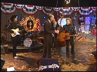 After a commercial break, Eddie Stubbs promoted the Superlatone Store. He introduced Marty. Marty said, "Thank you, Mr. Stubbs. And, Mr. Prine. Come around here, my friend. John Prine, thank you for comin' by." John said, "My pleasure." Marty continues, " Well, I tell ya what, I appreciate you bringin' Jason and Dave, too. They lookin' good this morning, Jason. Yes, sir. John, thank you for all your great songs you've given us." John said, "Thank you, Marty and thanks for having us here on the show." Marty said, "You betcha. Now there's one that is the national anthem of a lot of things. Would you do 'Paradise' for us?" John said, "I'd love to." Marty continued, "How 'bout a hand for Mr. John Prine. Thank you, John."