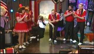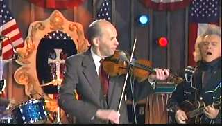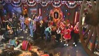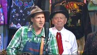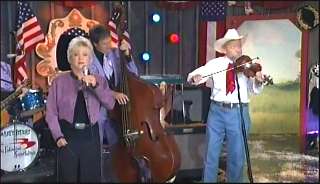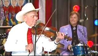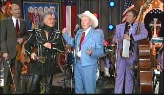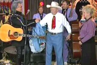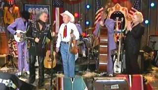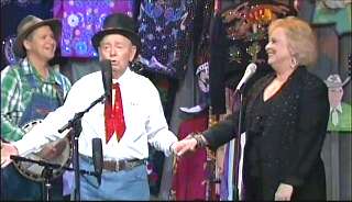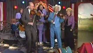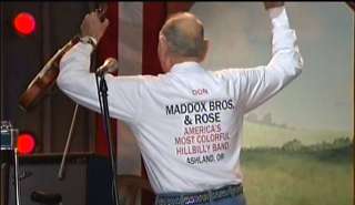 Marty said, "Opryland Hotel." Don said, "Opryland Hotel which I'd never been there before because I'm a Motel 6 kind of guy. And we got up there last night and he's got us the Presidential Suite up there and it's as big as this place. It's got two double beds in there. It's got two toilets. And I hardly ever use one toilet so I don't know what I'm gonna do with two toilets.And we got a big party room up there and it's just me and my wife in there so I wanna invite all you guys up for a big party tonight and Marty's gonna pay for all of it." Marty said, "One more piece of business. The Grand Ole Opry Square Dancers have come by to honor you and all the family today so Eddie Stubbs is gonna kick off 'Bile 'Em Cabbage Down'. If Apostle Paul will give you your fiddle back, you can jump in when you want to. How 'bout that." Don said, "That sounds great to me." Marty continued, "On behalf of The Maddox Brothers and Rose, how 'bout a hand for Eddie Stubbs and his flyin' fiddle and 'Bile 'Em Cabbage Down'. Come in Edwardo."
