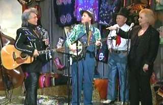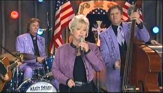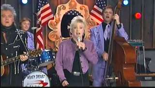 Don said, "Thank you, thank you, thank you, thank you." Marty said, "Mr. Don Juan Maddox right there." Eddie promoted Connie Smith's CD, Long Line Of Heartaches. After a commercial break, there was a montage of audio, video, and photographs of the Maddox Brothers and Rose. Marty said, "Welcome back, everybody. The Maddox Brothers and Rose, Superlatives. And over on the hay bale, how 'bout a hand for Miss Karen Wheeler, everybody. And, Superlatives? Hard to believe, Don Juan and his mule fiddle right there. Mr. Don Maddox, everybody. Turn around and show 'em your shirt, Don. America's most colorful hillbilly band." Don said, "You said 'The Superlatives'. What does superlative mean? I'm an old hillbilly and that's too big a word to me." Marty said, "It means we're dog gone good." Don said, "Thank you for explaining it." Marty said, "Speakin' of dog gone good, how 'bout a hand for Miss Connie Smith, everybody. Come here, baby. Look out. Hi Constance." Connie said, "How are you doin'?" Marty continued, "Did you hear Don tear up that fiddle song?" Connie said, "I heard him. That was great. We're proud to have you on this show." Don said, "I'm proud to be here." Marty said, "How 'bout a song from Sister Rose Maddox. Whataya think? Talk about it." Connie said, "I'd be honored. She was a great singer and it's kinda hard to follow her but I'm gonna do my best." Marty said, "What's it called?" Connie said, "It's called I'm goin' 'Down, Down, Down'." Marty said, "That's the one."