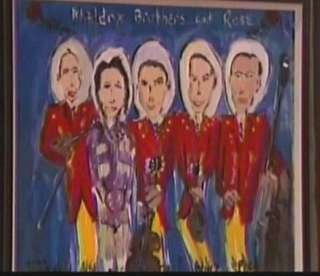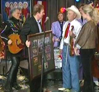 After a commercial break, Marty said, "Welcome back, everybody. Hasn't this been a great show today? Chris Scruggs, Superlatives, Eddie Stubbs, Karen, Leroy, Connie, and our honored guest. Come here Mr. Don Juan Maddox. On behalf of every country music band that ever traveled the west coast circuit, thank you, thank you, thank you, thank you. We are honored to have you here today." Don said, "Well, thank you for havin' me." Marty said, "Yes, sir. Couple of things. As a matter of fact, every time we have ever done a television show since the very first one, Sister Rose's dress has been with us and a painting of The Maddox Brothers and Rose." Don said, "Yeah." Marty continued, "And I wondered which one you were. You're the good lookin' one on there, ain't ya? Well, we're glad to have ya. Hey, a couple of family business things to take care of. The Academy of Country Music in Los Angeles. It's kinda the mother ship of all things great in California. Mr. Butch Waugh, the board of directors' President, and Tiffany Moon, the general manager, have come by to say hello and bring you a little token from the Academy of Country Music. Would you make them welcome, please. Where are you, Butch. Where are you, Tiffany. Aww, here they come. Yeah. Meet Don Maddox."
