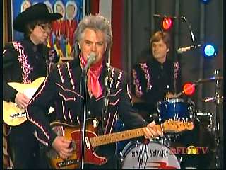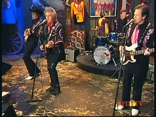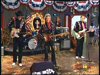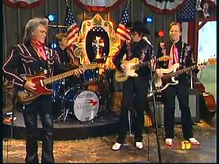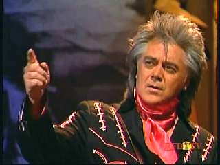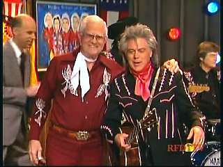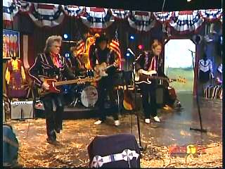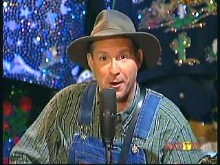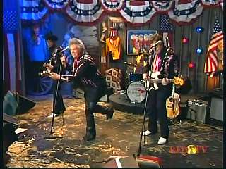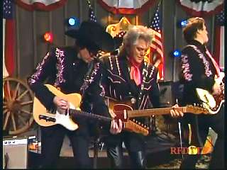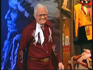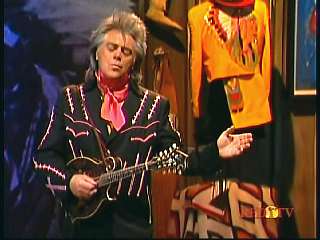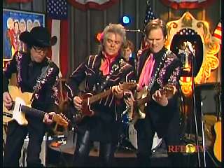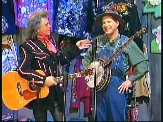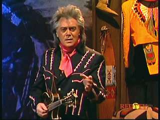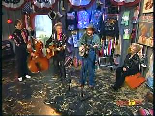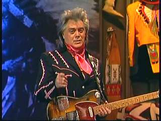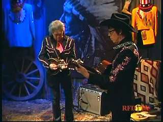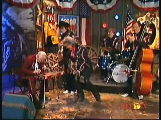 Eddie Stubbs said, "Mighty fine job there, Marty Stuart. 'Badlands'. That's the title track of one of his albums." Eddie then promoted Marty's photo book, Country Music: The Masters. After a commercial break, Marty said, "Thank you. Welcome back to The Marty Stuart Show." Hey, if you wanna talk to us by the way of the U.S. mail, write me at the Grand Ole Opry. Write Connie Smith at the Grand Ole Opry. The Fabulous Superlatives, Eddie Stubbs, Gary Carter, we'd all love to hear from you. And, Apostle, it's time, the time has come. We sang about South Dakota land. No tellin' what's on his mind. How 'bout a hand for the Sultan of Goodlettsville, the ole Tennessee Slicker, the most popular man in country music. Ladies and gentlemen, how 'bout a hand for Leroy Troy." Marty: "Hey. I got a greeting for you." Leroy: "What is it?." Marty: "I got a greeting for you from you all the folks in my hometown of Philadelphia, Mississippi at the Choctaw Indian reservation. You played down there last year and they just loved ya." Leroy: "Yeah, we had a ball, didn't we." Marty: "Looks like they scalped ya. All right " Marty removed Leroy's hat. "Whatcha got on your mind my favorite man of Goodlettsville?" Leroy: "Here's one called 'Nero Played His Fiddle While Rome Burned." Marty: "To the ground." Leroy: "All right." Marty: "An international event. Here it is."