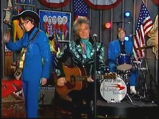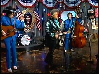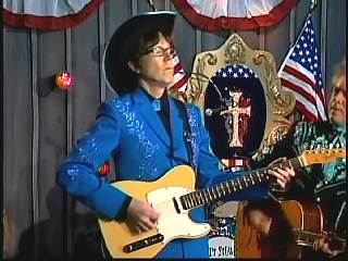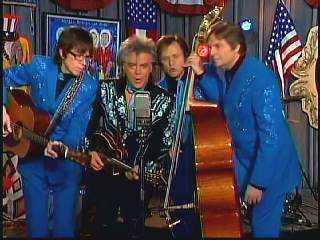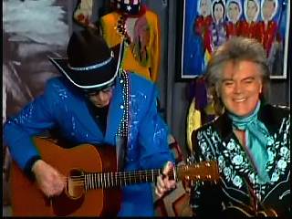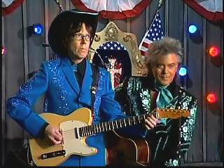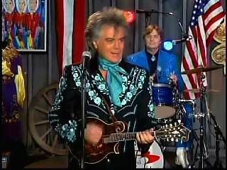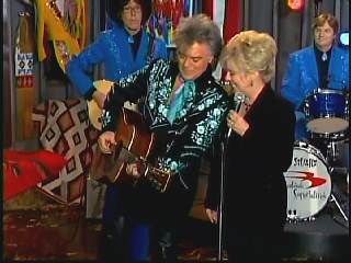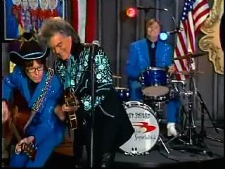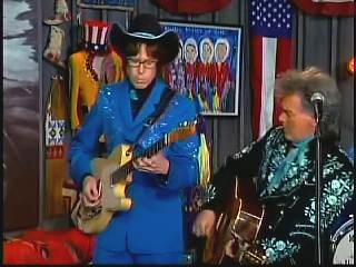 After a kissing Connie, Marty said, "Thank you, baby. You sold one record to Charley. I love Saturday nights. As Leroy Troy told me one time, Saturday night's the best night because it's the night of country music. And I grew up watching country music down in Mississippi. And some of my heroes, of course, were Buck Owens and the Buckaroos, Johnny Cash and the Tennessee Three, Charley Pride and the Pridesmen, George Jones and the Jones Boys. Flatt & Scruggs ..... all those boys. I wanted to grow up and do that. Back to Johnny Cash and The Tennessee Three, I loved those guys because they had a really strange-looking guitar player named .......Luther Perkins. And I loved Luther's playing. And John wrote a song for his little band that featured Luther's style of guitar playing to showcase him a little bit. And we took that song ...... left the first half alone to salute our old heroes, the Tennessee Three and kinda wrote the back half to reflect the Superlatives and Cousin Kenny Vaughan's unique style of guitar playing. So, Cous, shall we play 'Luther Played The Boogie Woogie,' ladies and gentlemen, in the strangest kind of way."
