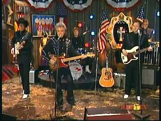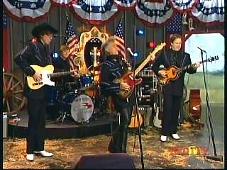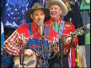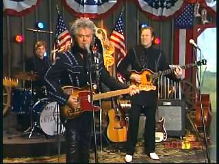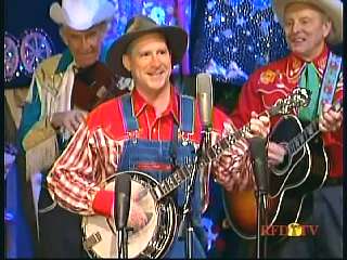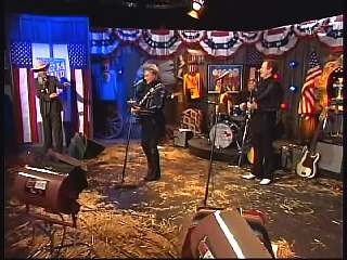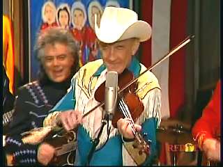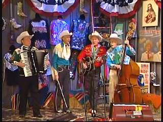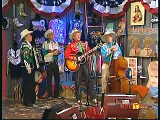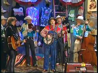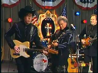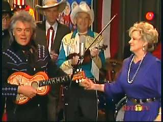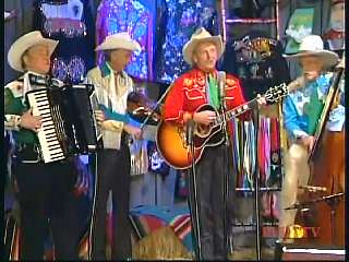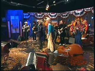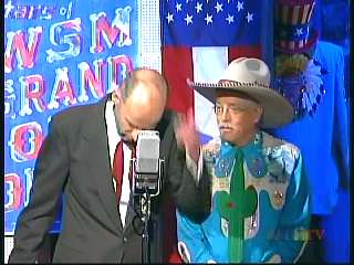 After a commercial break, Eddie Stubbs promoted the Superlatone Store. He introduced Marty. Marty said, "Truer words were never spoken from a man who's never seen a horse in person. Thank you, Tex. Ranger Doug, just in case there's any soul in America that don't know all the Riders In The Sky, would you please introduce the gentlemen?" Ranger Doug said, "I will take a moment. A man who has stood by my side for every one of the 32 years this band has been together, aging like fine cheese. That's Too Slim. Right here is the star of the upcoming motion picture Oh Brother, Where Am I?, that's Woody Paul, King of the Cowboy fiddlers. The Sultan of the stomach Steinway is Joey, the CowPolka King. And I remain Ranger Doug." Marty said, "The idol of American youth, the idol of American youth." Too Slim moves in next to Marty and says, "Marty, you're a great appreciator of fine instruments; you're a wonderful musician, we are presenting you with a Riders In The Sky guitar, ladies and gentlemen." Marty said, "Too Slim, I am honored, I am honored. Thank you, pal. Thank you, pal. It will go amongst the finest things." Too Slim said, "I know. Amongst the rest of the keepsakes that are available probably." Marty said, "That's beautiful. For your listening requirements. Hey, Ranger Doug. The last time we were here, Joey the CowPolka King and Cousin Kenny from the Fabulous Superlatives fame got together and played a polka." Ranger Doug said, "They had some fun." Marty continued, "Yes they did. But we left the great Woody Paul out. We should turn Woody Paul loose Whatcha got Woody Paul?" Woody Paul said, "Got the great 'East Tennessee Blues'." Marty said, "That's a big one. that's a big one. Make him feel welcome."