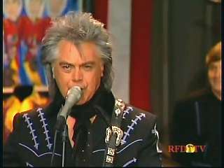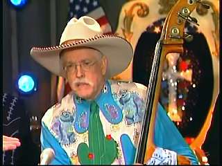 Marty said, "Yeah. Doesn't get any better than that. Hello Woody, Ranger, Too Slim." Eddie Stubbs said, " 'Press Along to the Big Corral'. Great sounds there from the Grammy-award winning Riders In The Sky. Thank you so much, fellas." Eddie promoted the two DVD set of highlights from the first season of The Marty Stuart Show. Too Slim joined Eddie making sounds while Eddie was reading the commercial, even exchanging cowboy hats with Eddie and mouthing the words of the commercial with Eddie. After finishing reading, Eddie said, " And we've got Too Slim visiting with us here right now and we have exchanged hats." Too Slim said, "I wondered if you knew I was here." Eddie said, "I did know you were here. And you know what? The Riders In The Sky had that hat made for me that you're wearing." Too Slim said, "How 'bout Eddie Stubbs' hat, ladies and gentlemen." Off camera, you could hear Marty say, "That's a fine hat." Eddie continued, "If I keep wearin' this, am I gonna go completely bald like you?" Too Slim said, "You go completely ... I rotated the crop here, Eddie, that's the great thing." Eddie said (taking off the hat), "Well, maybe I can borrow some of that for this here (showing his balding head)."