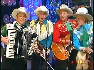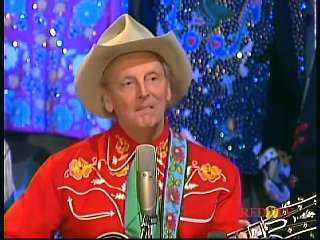 Marty said, "Happy trails to you, Leroy." Eddie said, "Great job there from Leroy Troy and 'The Happy Rovin' Cowboy'. Never heard Leroy do that. He sounds like he's ready to saddle up and head out on the trail. Well, we're gonna remove the hat right now because it's hymn time this week on the program, and we're gonna call on the Riders In The Sky to offer us our song of inspiration. Bob Nolan from the Sons of the Pioneers wrote this song years ago. 'Lord, You Made The Cowboy Happy'."