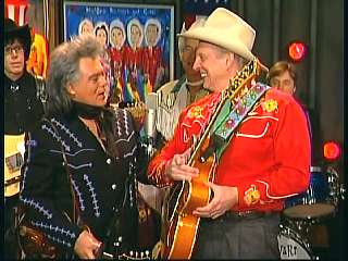 Eddie Stubbs said, "Marty Stuart right there singin' one of his own. 'A Hundred Years From Now'. Great job, fellas." Eddie then promoted Marty's photo book, Country Music: TheMasters. After a commercial break, Marty said, "Welcome back to The Marty Stuart Show, ladies and gentlemen. Hey, if you happen to notice, we've signs from our great state of Mississippi, my home state that I'm proud to be from, all around the set. If you're out drivin' around Mississippi, how 'bout going to Biloxi and see the beautiful lighthouse and the beaches. It's a sight to see. Speakin' of a sight to see, gentlemen. Here it comes. The Sultan of Goodlettsville, the most popular man in country music, Too Slim, the ole Tennessee Slicker. How 'bout a hand for Leroy Troy. Come here, Leroy. Hey Leroy, boy. Got your cowboy shirt on. There's the Riders In The Sky." Marty: "Look at you. Lookin' good with that cowboy shirt." Leroy: "Well, you know, I'm just tryin' to be a team player here." Marty: "Well, you've got it, you've got it." Leroy: "Doesn't make me look too slim, does it?" They all get the joke. Marty: "Whatcha got in mind to put all over America today and parts unknown?" Leroy: "Here it comes. 'The Happy Rovin' Cowboy'." Marty: "Well that's what it is."