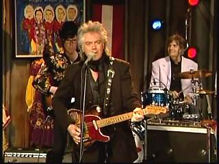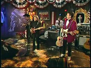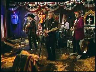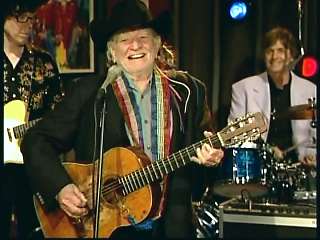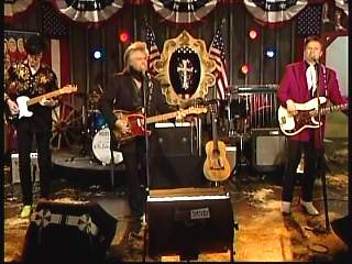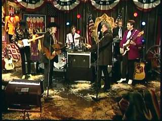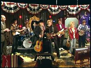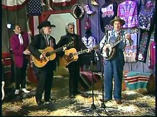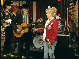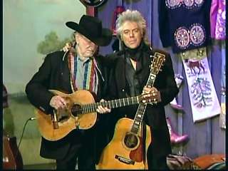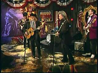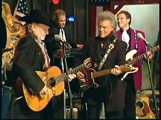 Eddie said, "Valuable advice and song there from Willie Nelson and Marty Stuart.together with 'Mama, Don't Let Your Babies Grow Up To Be Cowboys'. " Eddie promoted Marty's book of photographs, Country Music: The Masters. After a commercial break, in which RFD-TV congratulated Marty and Connie on their Grammy Nominations, Marty and Willie are on stage. Marty said, "All right, Willie." "All right," Marty and Willie said together. Marty continued, "Willie, I'm proud to tell ya that my home state of Mississippi is the sponsor of this show." Willie said, "All right." Marty continued, "And there's a town in east-central Mississippi that's near and dear to my heart and that's Meridian. I'm gonna tell ya all about in the weeks ahead. Meridian, Mississippi is Mississippi's royal city for country music. And the reason for that is it's the home of the Father of Country Music, Jimmie Rodgers." Willie said, "That's right." Marty continues, " You'll find the Jimmie Rodgers Museum there. It's a must-see. And if you like country music, I might suggest you atttend the Jimmie Rodgers Festival which has been happenin' each year the third weekend of May since 1953. And in Meridian, you'll find the Blues Trail Marker as well as a Country Music Trail Marker #1 honoring Jimmie at the Oak Grove cemetery where he now rests. While you're there, take him a flower. Speakin' of flowers, got one for ya." Willie said, "Whatcha got?" Marty said, "The Sultan of Goodlettsville, the ole Tennessee Slicker, the most popular man in country music. Gonna sing 'On The Road Again'. One of your big hits " Willie said, "All right." Marty says, "Here's Leroy Troy, Willie. How 'bout a hand for Leroy, everybody."