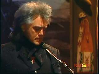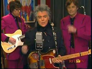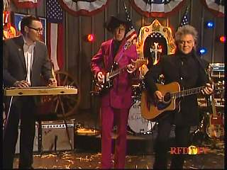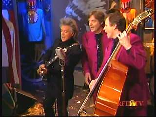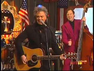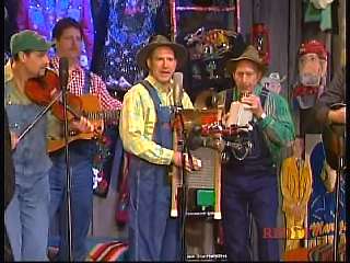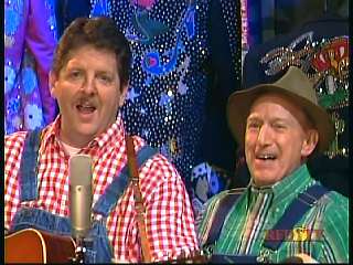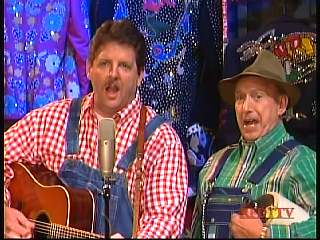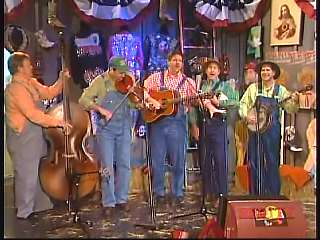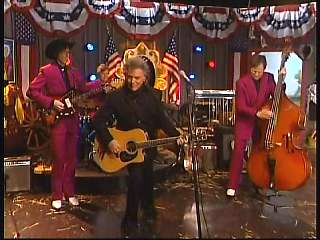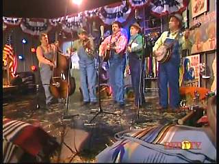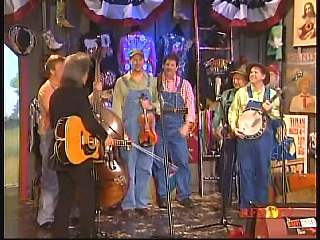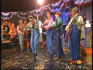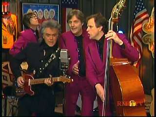 Marty said, "Well, now that's the way to do it right there. That's the way to do it. Fine job, Jug Band and Leroy." Eddie said, "Aw, The Tennessee Mafia Jug Band. They are so great. 'Charmin' Betsy'. We tried to get the fellas to bring Betsy along this trip but they wouldn't let her out for work release. There's always next time, I guess. Well, it's hymn time this week. The Fabulous Superlatives Quartet are gonna render this song for you right now. It's one that Marty Stuart and Handsome Harry Stinson wrote .... 'There's A Rainbow At The End Of Every Storm'."