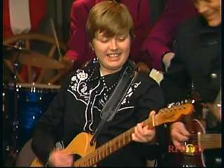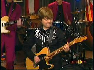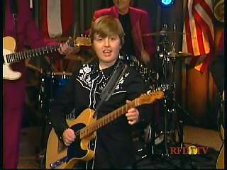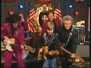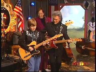 After a commercial break, Eddie Stubbs promoted the Superlatone Store. He introduced Marty. Marty said, "Look what I found, Eddie Stubbs. I found a guitar star, Superlatives. Eleven-year-old March Martin. Ya know where we found him? At the Apostle Paul's house. Him and Jamie got a house full of pretty kids that play music. March, welcome. Glad you're here." March said, "I am, too." Marty continued, "Well, I hear you're pretty bad on our theme song, 'La Tingo Tango'. I hear you can play a pretty bad version of it. Would you tear it up for us?" March said, "Sure." Marty said, "All right."