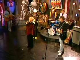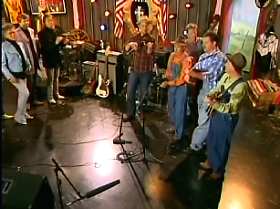 Marty welcomed everyone to the show. "Welcome to The Marty Stuart Show. If you're looking for country music like I said last week, you've come to the right place. Do you like country music? Huh? All right. That's all right with me. Hey Superlatives. I noticed when we got here the green pulpwood truck with the bass fiddle tied on top could only mean one thing. The Tennessee Mafia Jug Band is in town. How about a hand for the Tennessee Mafia Jug Band. Hello Leroy, Mike, Ferg, Matt Combs and there's Lester. Welcome to town boys. What's going on from the good word in Goodlettsville?" Leroy: "Well we got Lester and Mikey and Fergie and Matthew. We're all right here." Marty: "Well play us a pretty one. How about a hand for the Jug Band, ladies and gentlemen." Leroy: "This is for Mikey," They performed the song "Tied Down." Marty and His Fabulous Superlatives were side stage watching, clapping and Marty was dancing.
