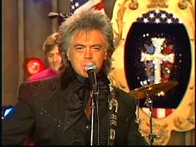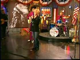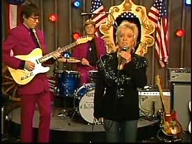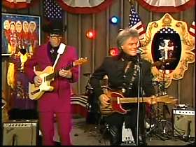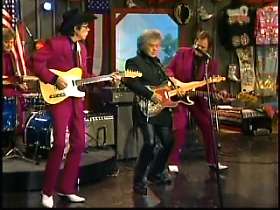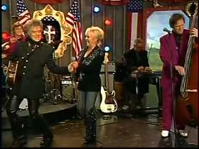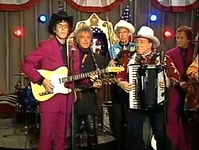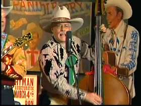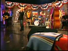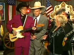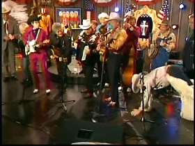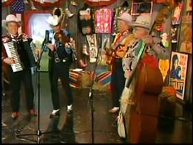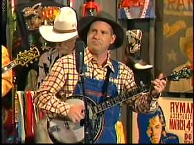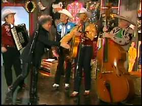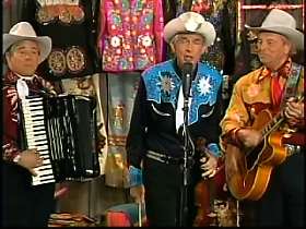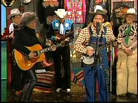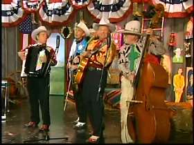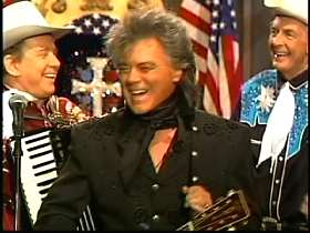 After a commercial break, Eddie Stubbs promoted Connie's CD Clinging To A Saving Hand. Marty said to Eddie, "Get your cowboy hat back on and join us. If you've enjoyed watching our show today and if you've enjoyed Eddie Stubbs hat, write me at the Grand Ole Opry. We'd be glad to hear from you. Superlatives, how about a hand for the Riders in the Sky, some of our big musical heroes. Ranger Doug, Woody Paul, Joey, Too Slim. It's an honor to have you guys. Cousin Kenny, Joey, the cow polka king, you know what to do. Here it is, 'Buck's Polka'."