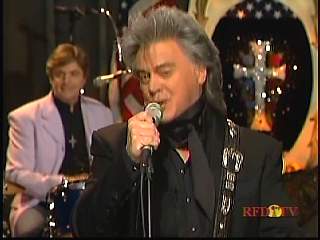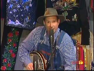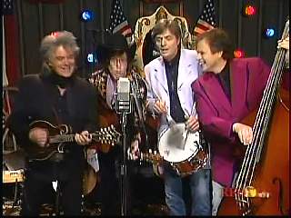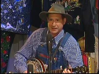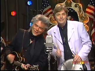Marty said, "So lucky, so lucky." Eddie Stubbs walked over to the microphone. Marty continued, "There's a lucky man right there. Lucky man." Eddie said, "That's the luckiest man I know, right there. He's got 18 belt loops on each pants' leg." Marty joked, "I can get out of 'em fast."Eddie said, "I bet you can." Eddie promoted Marty's photo book, Country Music: The Masters. After a commercial break, Marty said, "Thank you very much. Hey, if you would, write me at the Grand Ole Opry. Wanna know what you're thinkin'. Thank you for watching our show. And, Apostle, we're gonna send this show to the capital city of Mississippi, Jackson. And might even be a few people in Stallo, Mississippi watchin' us and Noxapater, too. You're welcome, too. But now, it's time. Emmylou, it's time........ for the Sultan of Goodlettsville, the most popular man in country music. Connie, here he is, the ole Tennessee Slicker, Leroy Troy. Make him feel welcome, ladies and gentlemen. Hey, look-a-there. Look-a-there (pointing to Connie and Emmylou who are sitting on the hay bales). Two of 'em. Nice ones." Leroy said, "Yeah." Marty continued, "Hello Leroy." Leroy said, "Hey, let's do 'Mountain Dew'." Marty said, Come on."