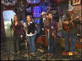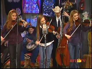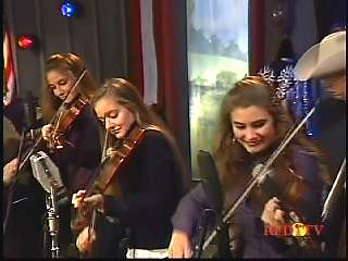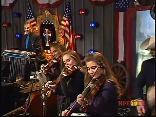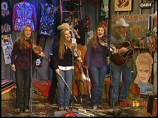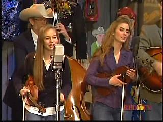 After a commercial break, Eddie Stubbs promoted the Superlatone Store. He introduced Marty. Marty said, "Why thank you, Mr. Stubbs. A fine job. I know why you're hangin' around over here. This is your favorite band right here." Eddie said, "I love these people." Marty continued, "I do, too. They're my favorites and Connie's favorites. They're all of our favorites and I appreciate the music you're makin' right now. Can we have one more song out of ya? Ladies and gentlemen, The Quebe Sisters Band. Come on, Eddie." The Quebe Sisters sang "How High The Moon."
