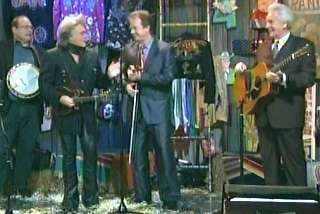 Leroy: "I know it, man. You got the million dollar band." Marty:  "That's what they are." Leroy: "And here I am surrounded by Stuarts." Marty: "Yes, sir. What us Stuarts to do with you." Leroy: "Well, ya'll gonna help me pedal. I got a bicycle to pedal." Marty: "All right." Leroy: "One called 'The Bicycle Wreck'." Marty: "What key?" Leroy: "G."  Marty said, "All right. A fabulous selection."  Eddie said, "Thanks so much, Leroy Troy. 'The Bicycle Wreck'. We're delighted to have Del McCoury with us today. He's a member of the Bluegrass Hall of Fame and he's gonna team up with Marty Stuart on one of the old favorites .....'Mansions For Me'."    After a commercial break, Eddie promoted Connie's CD boxed set Just For What I Am.   Eddie said, "And, once again, here's Marty Stuart." Marty said, "Thank you, Eddie Stubbs. How 'bout a nice hand for Eddie Stubbs, everybody. And how 'bout a hand for this million dollar band Stuart Duncan brought with him. Brother Del, brother Alan, Apostle Paul. Come here, Stuart Duncan. I'm so proud of you." Stuart said, "I'm proud of you." Marty continued, "I'm so proud of you. Watched you go from bein' a youngin' winnin' contests with your fiddle to be the most in-demand fiddle player probably in the world." Stuart said, "Oh please." Marty said, "You make us proud every time you step out." Stuart said, "I'm proud to be here." Marty said, "Thank you so much. What have you brought Del McCoury along for. Whataya got in mind with him." Stuart said, "Well, like you heard on 'The Lee Highway Blues', he's just the best rhythm guitar player you could ask for." Marty said, "I'll go along with that right there." Stuart said, "Some of folks out there might remember him as a tenor singer, too. And so I was hoping that he would help me do one where he sings, too." Del said, "I was hopin' you would do this." Marty laughed and said, "Well, let's do it." Stuart said, "Here's one called 'Long Journey Home'." Del and Marty said, "All right."