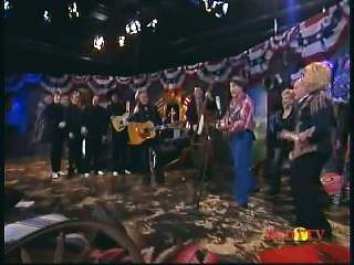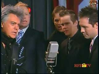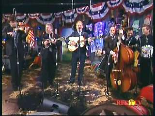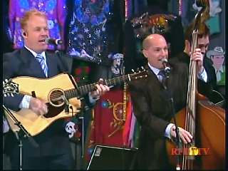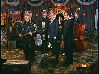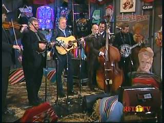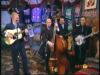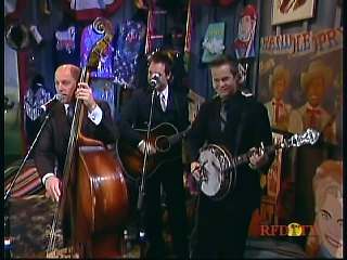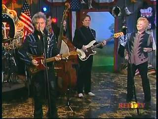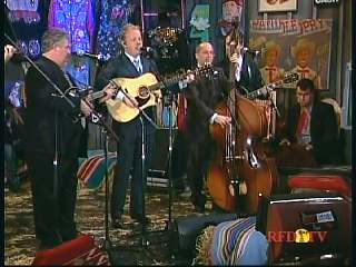 Marty said, "Hey. 'The Night Train To Memphis'. Fine job on the train song." Eddie Stubbs said, "Great old time music right there from Leroy Troy and Karen Wheeler and all the gang and 'Night Train To Memphis'. Well you know they were shoutin' Hallelueh and that got me to thinkin' that it's gonna be Sunday before we know it and we'd like to encourage you and yours to attend the church of your choice and with that theme in mind, we'd like to declare hymn time this week. We've got Dailey & Vincent and the whole group and, of course, Marty Stuart and The Fabulous Superlatives gathered around the mike to do one of one of the old Bill Monroe favorites .... "Get Down On Your Knees and Pray'."
