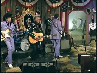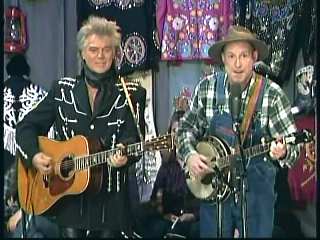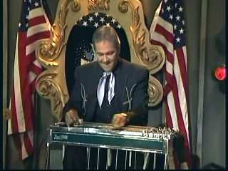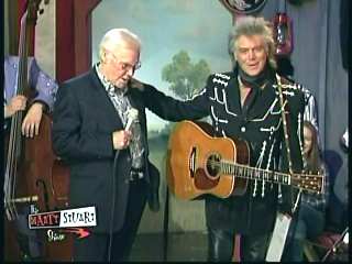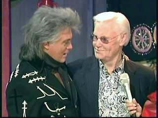 Eddie promoted Marty's book of photographs, Country Music: The Masters. After a commercial break, Marty and George Jones were on stage. Marty said, "Welcome back, everybody. Welcome back, Mr. Jones." George said, "Thank you, Marty." Marty continued, "All right. As always, I'm proud to tell ya that this show is sponsored by my friends in Mississippi. Now, about 80 miles up the road from the historical old capital building, Mississippi's capital of Jackson, is the Queen city of Meridian. Meridian is regarded as and important railroad town. To celebrate that, Meridian's own Railroad Museum and the Mississippi Heritage Museum join together annually on the first weekend in November for a festival known as Whistle Stop Weekend. It's a free event, filled with fun and good community fellowship. George, listen close and you might even hear Jimmie Rodgers sing a song." George said, "I tell ya what. I'd love to hear that." Marty said, "Me, too, buddy. How 'bout a hand for everybody in Meridian, ladies and gentlemen. Famous, famous, famous." Marty holds up an old issue of Country Music magazine and says, "Look here. Look here at what I got." George said, "Where in the world did you find that?" Marty said, "The Country Music Hall of Fame sent this over there. And Tammy says to George...." George says, "How do ya like them sideburns?" Marty said, "That's nice. Them is pork chops." George and Marty laugh. Marty said, "Tammy said, 'Who's your favorite girl singer?' and George said ...." George said, "Connie Smith." Marty said, "There ya go." George said, "Went over real big then." Marty and George laughed. Marty said, "Well, here's how it works at my house. You're her favorite singer but Tammy Wynette's my favorite girl singer, too." George said, "Well, it's all in the family." Marty said, "It's all in the family. Naw, it really is Connie. I tell ya what. Speakin' of famous though and all in the family, here he comes. You're gonna love this. It's the old Sultan of Goodlettsville, the Tennessee Slicker, George. Leroy Troy. How 'bout a hand for Leroy, everybody. What about it. Hello, Leroy. You know George." Leroy said, "Hey, George." Marty said, "The Quebes .... Whatcha got on your mind?"