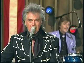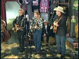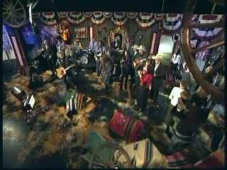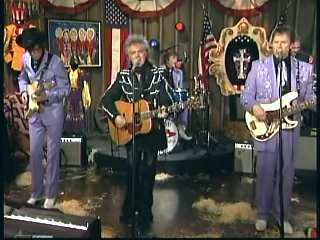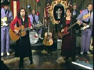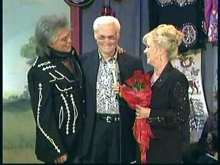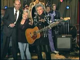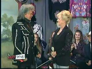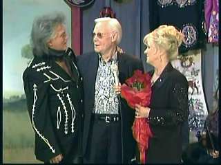 Marty said, "That's the Quebe Sisters Band right there.That's the way to do that. Attaboy Joey, too. Ladies. After a commercial break, Marty and Connie were on stage. Marty said, "Welcome back and we still love Connie Smith. We love The Quebe Sisters Band." Connie said, "I love The Quebe Sisters Band." Marty said, "How 'bout a hand for The Quebe Sisters Band. Constance, who's your favorite male country singer of all time?" Connie said, "Everybody knows it's George Jones." Marty said, "George Jones is here to say 'hi' to you. How 'bout a hand for the greatest country singer of all time, George Jones. Come here, George." George came onstage carrying a bouquet of red roses for Connie. George said, "Marty, how ya doin'?" Marty said, "All right, George." Connie said, "Hi George." George said, "My favorite singer." Connie said, "Oh, bless your heart." George said, "Some beautiful flowers for a wonderful, beautiful lady." Connie said, "Thank you, George." George said, "And I mean that." Connie said, "Aw, you being here is special." Marty said, "Hi, Possum. Oh we can't thank ya enough for comin' by. I have to listen to a lot of George Jones music at my house and that's all right with me." George said, "Well, I appreciate that." Marty said, "Yes, sir." George said, "And the next time I'm on your show, I'm gonna try to sing a song." Marty said, "That will be fine." Connie said, "I can't wait." Marty said, "Tell ya in the mean time, you just get over there and relax and we'll sing a couple for you." George said, "I'm gonna listen real big then."