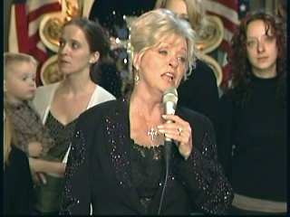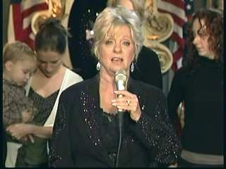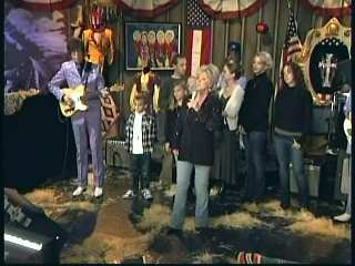 Marty said, "Yes, sir, Leroy. That oughta get her done right there." Marty and Connie are on stage. Marty says, "Leroy's family. And I know that family's important to you. It is the ultimate thing to you." Connie sayd, "Yes." Marty continued, "I've often said that if Connie was going to get the greatest award in the world and one of the kids called, the award would have to wait and that's the way it is. Concernin' family, your momma-in-law, your daddy-in-law, and your sister-in-law, John, Hilda and Jennifer are out there. Give 'em a nice hand for comin'." Connie said, "I love you." Marty said, "Connie has a son in Taiwan, Kerry. Darren is in Norway with three grandbabies so they couldn't be here, but some of your other babies got to come today. How 'bout a hand for Connie's Jeanne, Jodi and Julie and all the grandbabies. There they come. Aw, yeah. Jonas and Jordan, Dylan, Zander. Gather around your mama here, children. Hi Jonas." Connie sang, "You'll See Jesus."