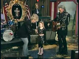 After a commercial break, Eddie Stubbs promoted Connie's Born To Sing boxed set at the Superlatone Store. Eddie said, "Everybody loves Marty Stuart and, most of all, everybody loves Connie Smith. Here they are once again." Marty said, "That's right and everybody loves Eddie Stubbs, too at our house." Connie said, "Everybody loves Eddie Stubbs." Marty continues, "How 'bout a hand for Mr. Stubbs. He's family." Connie said, "That's right. You're family." Marty said, "Well, as I mentioned before, you love family. We're all about family. Love the family of country music. Love our family. And you and I watch for babies to come along that have it, don't we?" Connie said, "Yes, we do." Marty continued, "Paul Martin and Jamie's house is full of it." Connie said, "What a family." Marty said, "Great family." Connie said, "They've got a wonderful family." Marty said, "Full of music." Connie said, "Yes.And I've heard the boys and I've seen them on the show and can we bring out one of the girls?" Marty said, "Yeah." Connie said, "My favorite little singer right now. Her name is Miss Texas Martin." Marty said, "We must have a hand for Texas." Connie said, "She's five years old." Marty said, "Awww." Connie said, "That's how old I was when I said I was gonna sing on the Grand Ole Opry. Here, Texas." Texas sang "Somewhere Over The Rainbow" with proud daddy, Paul, accompanying her on piano.