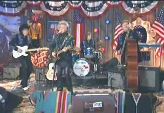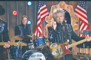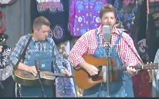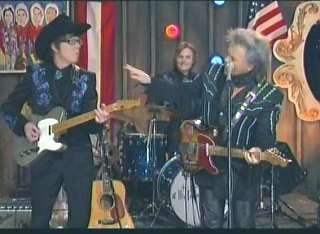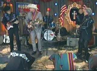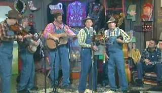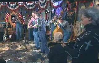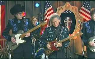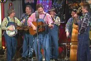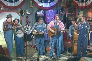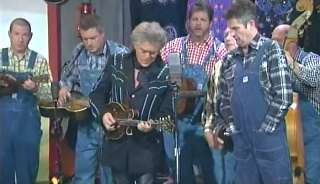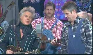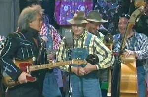 Eddie said, "Marty Stuart right there and singin' it like he's lived it. In fact, he wrote that. 'That's How Lonely Feels'." Eddie promoted Connie's CD boxed set Just For What I Am." After a commercial break, Marty said, "Welcome back, ladies and gentlemen. I'm proud to say that this broadcast is sponsored each and every week by the great state of Mississippi. Now the Magnolia state is regarded as the birthplace of America's music. You'll find nearly 200 historical stops along the Blues and Country Music Trails that run throughout the state and celebrate some of the most notable names and places in American music history. One such name that the entire world knows and loves is Muddy Waters. How 'bout a hand for the cat daddy of the blues. You'll find two Blues Trail markers with Mr. Muddy Waters' name on them. Both located in the Mississippi Delta land. Marker #1 is in Rolling Fork, Mississippi at the site of Muddy's birthplace. And Marker #2 is in Clarksdale, Mississippi at Muddy's cabin. I encourage you to go be a part of that Muddy Waters feelin' in the famous Mississippi Delta land. And 217 miles down the road from the Delta land is Meridian, Mississippi. The Emerald city of Meridian has already more music trail markers than any other place in Mississippi. While another one has recently been added to the Blues Trail and it has my buddy Hartley Peavey's name on it. Been a lot of blues pumped through the equipment that says Peavey on the front. And Meridian is the home of Peavey. So how 'bout a hand for dear ole Mississippi, the city of Meridian which now has a total of six Blues and Country Music Trail markers. Whoo Hoo. Speakin' of whoo hoo, how 'bout a hand for The Jug Band, ladies and gentlemen. Come here, Mikey. Come up here. I know out at Lonesome Lesters Loafin' Lounge, the band hall of headquarters. World headquarters of The Jug Band, the biggest picture out there is Mr. Roy Acuff and the Smoky Mountain Boys." Mike Armistead said, "Absolutely." Marty said, "You guys have done a wonderful job of keepin' Mr. Acuff's wonderful music alive. And we're honored to have on our set today, Bashful Brother Oswald's dobro in the good hands of Mike Webb. How 'bout a hand for Os and Webb. Play me just a little bit of 'The Cannonball'. Could ya sing 'The Sunshine Special' for me." Mike said, "Absolutely." Marty said, "How 'bout a hand for Mike and 'The Sunshine Special'."