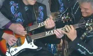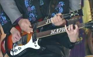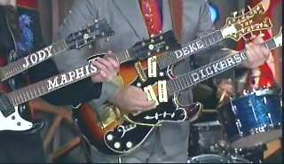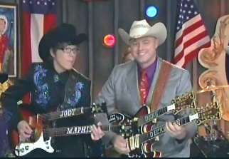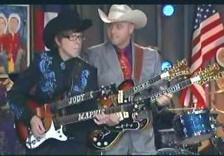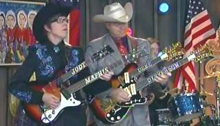 After a commercial break, Eddie promoted Nashville, Volume 1: Tear The Woodpile Down. Eddie said, "And now, here is Marty Stuart." Marty said, "Thank you, Eddie Stubbs. How 'bout a hand for Mr. Eddie Stubbs, ladies and gentlemen. Fine job. Superlatives? Hollywood is in the house. So honored to have our man who is the correspondent of all things cool, guitar and Cadillac in country music in California up and down the west coast. Everybody loves Mr. Deke Dickerson. Make Deke feel welcome. Hey Deke. Hey Deke." Deke said, "Good to see ya, Marty." Marty said, "You guitar star, you. Welcome to the show. Welcome. Thank you for joinin' us." Deke said, "I'm glad to be here, Marty." Marty continued, "You do so many good things out there in the west land for our country music world. Thank ya." Deke said, "I appreciate it." Marty said, "Whatcha got on your mind, pal?." Deke said, "Well, we're gonna do an old Joe Maphis and Larry Collins song for ya right now." Marty said, "You got the gear to do that with." Deke said, "We got some duelin' Mosrite double-necks, me and Kenny. Like to send this one out to Larry and Lorrie Collins, Rosalie Maphis and, of course, Duane Eddy sittin' in the front row right there." Marty said, "No pressure. No pressure. What's it called?" Deke said, "A little thing called "Early American'." Marty said, "All right."