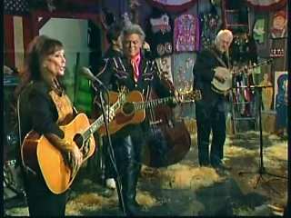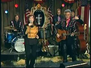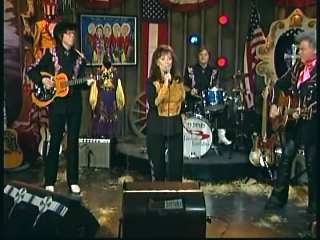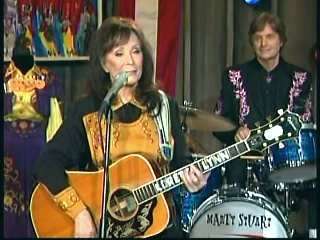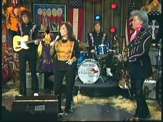 After a commercial break, Eddie Stubbs promoted Compadires: An Anthology Of Duets at the Superlatone Store. Eddie said, "Once again, here's Marty Stuart." Marty said, "Thank you, Eddie Stubbs. How 'bout a hand for Eddie Stubbs, everybody. Didn't he do a fine job." Connie said, "Ain't he pretty." Marty continued, "Hey, Connie Smith." Connie said, "Yes." Marty said, "Who's your favorite girl singer of all time?" Connie said, "Well, everybody knows it's Loretta Lynn." Marty said, "How 'bout that. I love that. Come here. I wanna tell you somethin'." Loretta said, "Okay." Marty said, "Last week, George Jones was on the show and she said that George Jones was her favorite singer of all time. If she don't straighten up ..." Connie interjected, "Male singer." Marty continued, "Can I come to your house?" Loretta said, "Yeah, honey." Marty said, "All right. That's the way it is right there. Ya'll heard it right here." Loretta laughed and said, "Oh me." Marty said, "I love every song you've ever done and that's the truth. I love every Loretta Lynn song. But there's one in particular that touches my heart mighty deep. Would you please do 'Blue Kentucky Girl' for us." Loretta said, "That's one of my favorite, too." Marty said, "All right. We'll have ole Mark Casstevens take it off here. Markus......"