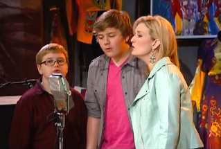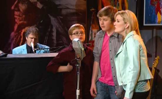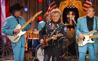 Marty said, "That's Eddie Stubbs and his flyin' fiddle. 'Pretty Polly Ann'. And a member of the Country Radio Hall of Fame, too. Big doin's. There he goes. Eddie Stubbs did good, didn't he?" Leroy Troy said, "He sure did." Marty continued, "He did good. I love Eddie Stubbs and I love his fiddle playin', and I love these people right here. I've said it before. Paul Martin is one of the most blessed men on planet Earth. When it's time to play music, all he has to do is call order to the house. Along with Jamie, March, and Kell -- that's just some of 'em. How 'bout a hand for The Martins. Go ahead, Apostle. Talk about your home state of Kentucky." Paul said, "My home state. This is a tune about my home state of Kentucky." They performed "My Old Kentucky Home."