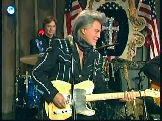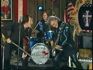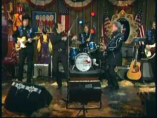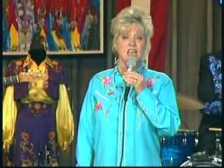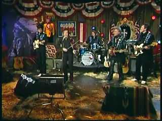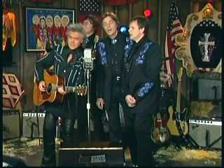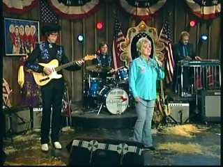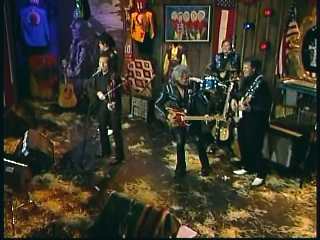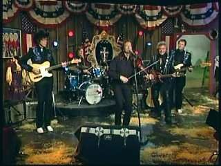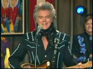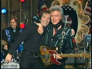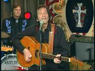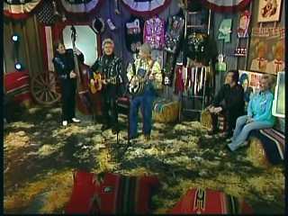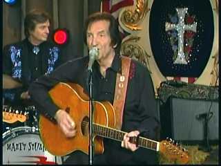 Doug Kershaw said, "Blue Town." Eddie promoted Marty's book of photographs, Country Music: The Masters. After a commercial break, Marty said, "Well, all right. Let's talk about our sponsor, Apostle. What do ya think? Well, I'm speakin' of the great state of Mississippi. They sponsor The Marty Stuart Show. And Mississippi is called the birthplace of America's music. The honorable home of much roots music royalty. Over the next couple of weeks, I'm gonna be tellin' ya about important destinations in central Mississippi on the Blues and Country Music Trails. Tonight, it's Meridian, which is a royal music city. It was the home of one of America's musical forefathers, Jimmie Rodgers, who is honored with a Blues Trail Marker as well as Country Music Trail Marker #1. Jimmie's songwritin' pal, Miss Elsie McWilliams has a trail marker in her honor at the courthouse. And in the near future, the granddaddy of all the American music festivals. the Jimmie Rodgers Festival, which was established back in 1953 will receive a marker all its own. Two more Blues Trail Markers honoring a host of Mississippi's blues and jazz musicians will soon be unveiled, makin' Meridian, Mississippi the most awarded city on the Blues and Country Music Trail. Marker. A great honor indeed. How 'bout a hand for our friends in Meridian. Apostle....." Paul said, "Yes." Marty continued, "Doug, Connie. Speakin' of honors. It is indeed an honor to introduce the Sultan of Goodlettsville, the ole Tennessee Slicker, the most popular man in country music, how 'bout a hand for Leroy Troy, everybody. Come here, Leroy. Hey, Hey." Leroy sang a parody of "Ghost Riders In The Sky" called "Ghost Chickens In The Sky." Marty cracked up hysterically each time Leroy did his rooster crow.