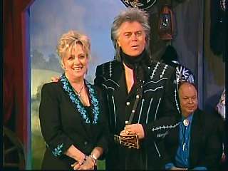 Marty said, "Yeah. Good job Sundowners.Good job, Mr. Wright." Eddie Stubbs said, "What a great band. The Sundowners right there with 'Eastbound and Down'.That's some great travelin' music, fellas. Thank you so much." Eddie then promoted Marty's photo book, Country Music: The Masters. After a commercial break, Marty said, "What about it, Apostle. Yes sir. A place that Connie and I love down in Mississippi is the Commerce Boulevard Christian Church located at 2906 Casino Strip Resorts Boulevard in Robinsonville, Mississippi. When you lose all your money in Tunica, go right down the road to see Pastor Evelyn Hubbard and all the folks and they'll make ya feel welcome every Sunday morning. Eleven o'clock, you'll feel some of the best singin' and preachin' you've ever heard in your life and felt in your life. They'll uplift ya and love ya. .Home of The Fabulous Superlatives, that's our church. That's right. Speakin' of the biggest cathedral in anybody's heart. Here it comes, the Sultan of Goodlettsville, ladies and gentlemen, Connie, the ole Tennessee Slicker, why don't we just adopt him." Connie said, "We did." Marty continued, "We did. All right. Ladies and gentlemen, without further adieu, the great Leroy Troy. Come here, Leroy. There ya go, Constance. Well all right. I owe you a big ole thank you."