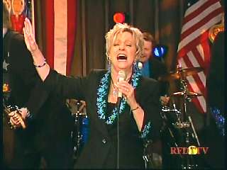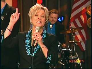 Marty said, "Fine job, Handsome. Still married." Eddie Stubbs said, " 'Sailing Around The Moon (With Pretty Little Constance June)'. I wonder if the folks at NASA know that Connie's been implemented into the space program. We'll have to make sure they get a record of that there. Leroy's got that on a great record too as a matter of fact. Well, it's time to get serious with ya right now and we'd like to declare hymn time this week. And we're gonna get all the cast to join in behind Connie Smith as she sings one of her favorite tunes that was written and put out years ago by Miss Martha Carson. It's called 'Satisfied'."