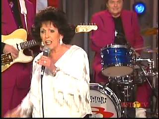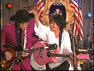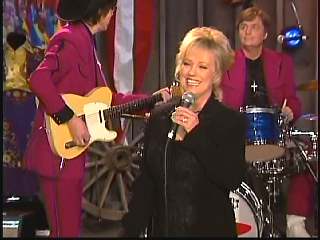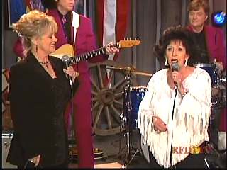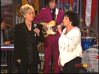 Marty brought Wanda Jackson back on stage and said, "Baby, here's Miss Wanda Jackson, in person." Connie said, "I'm so honored just to be in your presence." Wanda said, "It was worth my trip to hear you sing." Connie said, "Oh bless your heart." Marty said, "I wanna hear the two of you sing a song together. Never been done, right?" Wanda said, "Never done" and Connie said, "No." Marty said, "Well, can we take care of it?" Wanda said, "Why not. "Silver Threads And Golden Needles'." Marty said, "My favorite, my favorite. Come on." Wanda said, "We're gonna do all the verses."